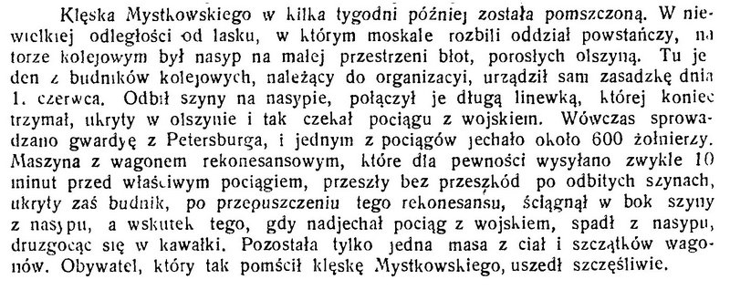 Powstanie Styczniowe było pierwszą regularną wojną partyzancką na ziemiach polskich. Także na Mazowszu, po kilku miesiącach zmagań, oddziały powstańcze najbezpieczniej czuły się w lasach. To stamtąd najwygodniej było atakować posterunki rozmieszczone w miasteczkach, przejeżdżające pociągi z wojskiem i zaopatrzeniem a także oddziały wroga przemieszczające się niezbyt gęstą siecią marnej jakości dróg Królestwa Kongresowego. W maju i czerwcu większość starć na wschodnim Mazowszu miało miejsce w obwodach pułtuskim, ostrołęckim i stanisławowskim. Najcięższe bitwy rozegrały się w tym czasie w ówczesnym obwodzie ostrołęckim. Spośród kilku bitew najgłośniejsza była ta pod Nagoszewem k. Ostrowi Mazowieckiej z 2 na 3 czerwca 1863 r. Oprócz regularnych, zaprawionych w boju oddziałów wzięło w niej udział 150 miejscowych kosynierów z Nagoszewa i Osuchowej. Bitwa ta przeszła do legendy także dlatego, że trzech mieszkańców Nagoszewa podpaliło własne stodoły, w których zabarykadowali się rosyjscy żołnierze… W płomieniach zginęli też sami gospodarze! Z kolei 13 maja pod Kietlanką powstańcy słynnego Ignacego Mystkowkiego usiłowali wykoleić rosyjski pociąg, ale udało się to tylko częściowo na skutek zdrady dróżnika z Czyżewa. Na miejscu zginął Mystkowski i większość dowódców. Niemniej, jak czytamy w wydanej w 1913 r. w Szwajcarii książce „Bitwy i potyczki 1863-1864”…