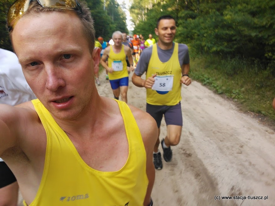 Jako że bieg odbywał się w godzinach wieczornych panował przyjemny chłód. Na starcie stanęło stu zawodników. Trasa prowadziła po leśnych dróżkach przebiegających po części przy ważnych historycznych miejscach. Wstępnie założyliśmy, że biegniemy na czas ok. 1:45… realizacja planu podczas biegu przebiegała na tyle skutecznie że Marcin w locie zrywał poziomki i… nas częstował. Były naprawdę pyszne. Na metę wbiegamy razem (Marcin Dymiński, Leszek Rosa i Ryszard Mazurek) i całej naszej trójce odnotowując czas 1:43:00. Po biegu biesiada na całego. Jedzenie w ilościach „nie do przerobienia” kto nie kierował i chciał uzupełnić kalorie płynne, serwowano mu piwo. Była też możliwość zaopatrzenia się w lokalny wysokoprocentowy trunek „własnej roboty”. Podsumowując krótko: impreza z takim klimatem to esencja biegania.