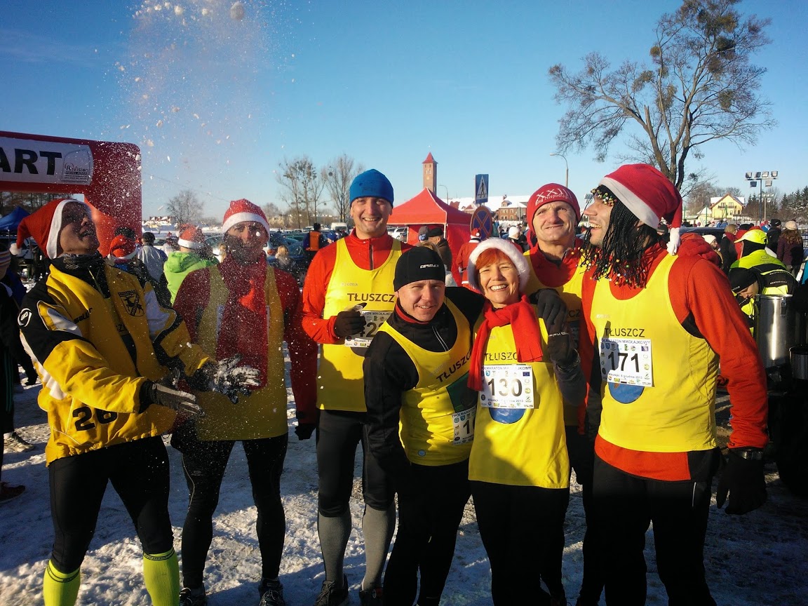 Jeszcze na dwa dni przed biegiem w Mikołajkach, każdy z nas odczuwał na własnej skórze siłę huraganu „Ksawery”. Niewiadomą więc było jakie warunki będą na nas czekać w dniu biegu. Padały pytania, czy w ogóle da się dojechać i czy w ogóle bieg się odbędzie. Wystarczyło trochę wiary, ducha, biegowego zacięcia, by z Bożą pomocą przez śniegi i skute lodem drogi dojechać cało na miejsce startu. 8 grudnia przywitał nas mazurski pejzaż zaśnieżonych moren polodowcowych i rozległych jezior w których tego dnia słońce odbijało z intensywnością refleksy. Nasze barwy reprezentowali: Ela i Leszek Rosa, Adam Lipiński, Janusz Łuczyk, Ryszard Mazurek, Mariusz Michalak i Marcin Dymiński. Sprawnie odebraliśmy pakiety z mikołajową koszulką i mikołajową czapką (lekko dla niektórych przymałą). Wyluzowani wystartowaliśmy wspólnie drużyną na końcu 300-osobowego peletonu. Trasa półmaratonu prowadziła gruntową drogą, miejscami oblodzoną, przez Rezerwat Łuknajno z nawrotką na ustrojonej choince. Biegło się przy niewielkim mrozie, długo z górki i pod górkę, z wiatrem i pod wiatr (jak to bywa przy pętlach), skąpani słońcem na tle błękitnego nieba. Co niektórzy biegli poprzebierani, a to za młodą parę, a to za aniołka, a to za Jamajczyka – Boba Marleya (w tej roli nasz Rycho).