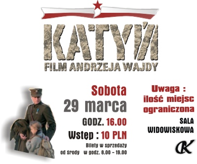 Centrum Kultury w Tłuszczu zaprasza na film Andrzeja Wajdy “KATYŃ“. Seans odbędą się w sobotę 29 marca, o godz. 16.00 w sali widowiskowej. Bilety w cenie 10 PLN do kupienia od środy w biurze CK . Uwaga – ilość miejsc ograniczona!
