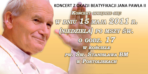 W niedzielę 15 maja po mszy świętej o godz. 17.00, w kościele w Postoliskach, z okazji beatyfikacji Jana Pawła II odbędzie się koncert sopranistki Barbary Żarnowieckiej oraz towarzyszącej jej na organach Wiktora Brzuchacza.