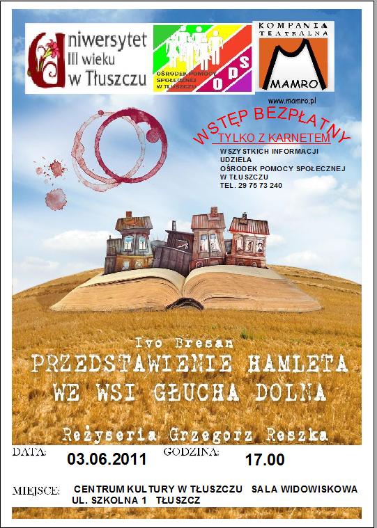 W piątek 3 czerwca w Centrum Kultury w Tłuszczu odbędzie się “Przedstawienie Hamleta we wsi Głucha Dolna”.