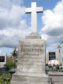 (7) Grób śp. księdza Ignacego Romualda Batogowskiego. Napis na pomniku: b. benedyktyn, proboszcz tutej. Parafji. ur. 1820 r. zm.1908 r. Prosi o Zdrowaś Marya. Wdzięczni …(dalej napis nieczytelny)