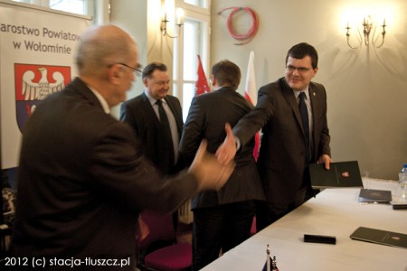 Chrzęsne, 18 stycznia 2012 roku: Uroczyste podpisanie umowy na dofinansowanie prac remontowych w zabytkowym pałacu. Wszystko wskazuje na to, że od przyszłego roku w wyremontowanym budynku będzie działało powiatowe centrum kultury. Na zdjęciu od lewej wicestarosta Konrad Rytel, marszałek Adam Struzik, wicemarszałek Krzysztof Strzałkowski i starosta Piotr Uściński (fot. Maciej Puławski)