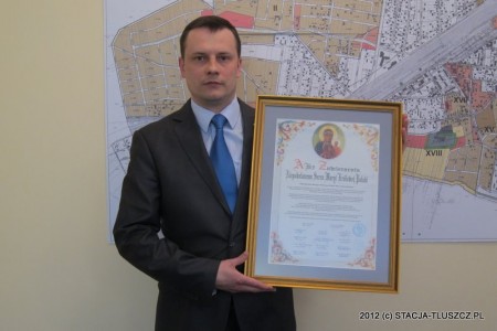 Tłuszcz, 9.02.2012: Burmistrz Tłuszcza Paweł Bednarczyk przedstawia Akt Zawierzenia Niepokalanemu Sercu Maryi Królowej Polski naszej gminy i jej mieszkańców. 2 lutego wszyscy wójtowie i burmistrzowie z terenu powiatu wołomińskiego udali się wraz ze starostą, wicestarostą i przedstawicielami duchowieństwa na pielgrzymkę do Częstochowy. Tam uroczyście zawierzono mieszkańców powiatu opiece Maryi Królowej Polski (fot. Maciej Puławski)