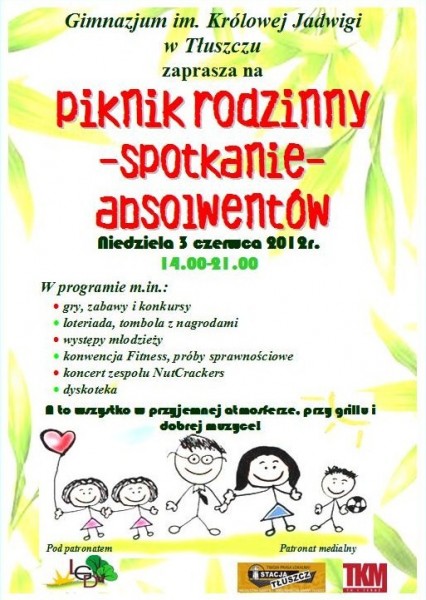 Gimnazjum im. Królowej Jadwigi w Tłuszczu zaprasza na PIKNIK RODZINNY połączony ze SPOTKANIEM ABSOLWENTÓW – niedziela, 3 czerwca 2012 roku.