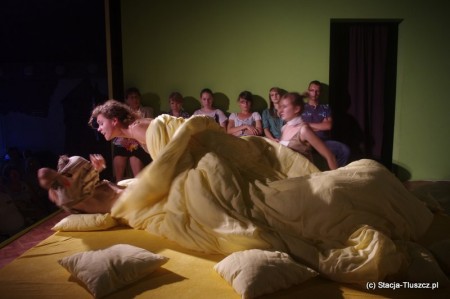 Zaczęło się nietypowo, gdyż reżyser zaprosił kilku widzów na scenę, gdzie mogli oni usiąść dookoła konstrukcji przypominająca łóżko, z wieloma poduszkami i kołdrą, pod którą niewątpliwie coś się kryło. Jak się potem okazało, była to czwórka aktorów, którzy przez cały spektakl się tam chowali, wyłaniając się jedynie w momentach, gdy musieli odegrać swoją scenę.