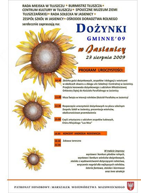 12.30 - rozpoczęcie uroczystości dożynkowych na placu szkolnym Zespołu Szkół W Jasienicy: prezentacja wieńców, okolicznościowe przemówienia
