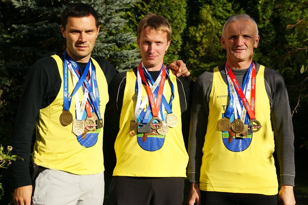 Zdobywcy Korony Maratonów Polskich z klubu Bóbr Tłuszcz: Ryszard Mazurek, Marcin Dymiński, Leszek Rosa