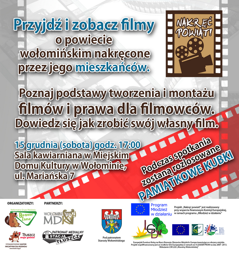 Nieformalna Grupa Młodzieży „Beaver Zone” i Stowarzyszenie Kastor – Inicjatywa dla Rozwoju zapraszają na spotkanie, na którym każdy będzie miał okazję dowiedzieć się jak zrobić własny film oraz obejrzeć filmy o powiecie wołomińskim nakręcone w ramach projektu „Nakręć powiat!”. Więcej informacji w ogłoszeniu.