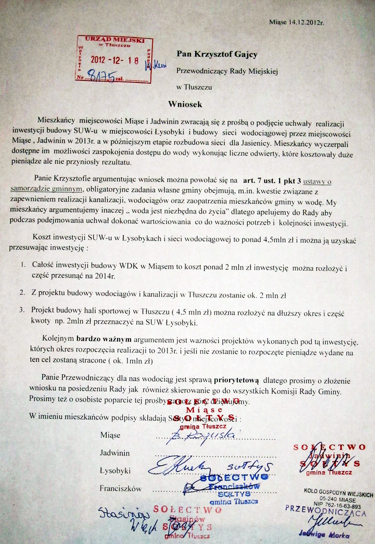W imieniu mieszkańców Miąsego i okolic, sołtysi z miejscowości Jadwinin, Łysobykyki, Miąse, Franciszków i Stasinów złożyli do Przewodniczącego Rady Miejskiej wniosek z prośbą o podjęcie uchwały realizacji budowy Stacji Uzdatniania Wody w Łysobykach i budowy sieci wodociągowej przez Miąse i Jadwinin w 2013 roku, a w późniejszym etapie rozbudowy sieci dla Jasienicy.