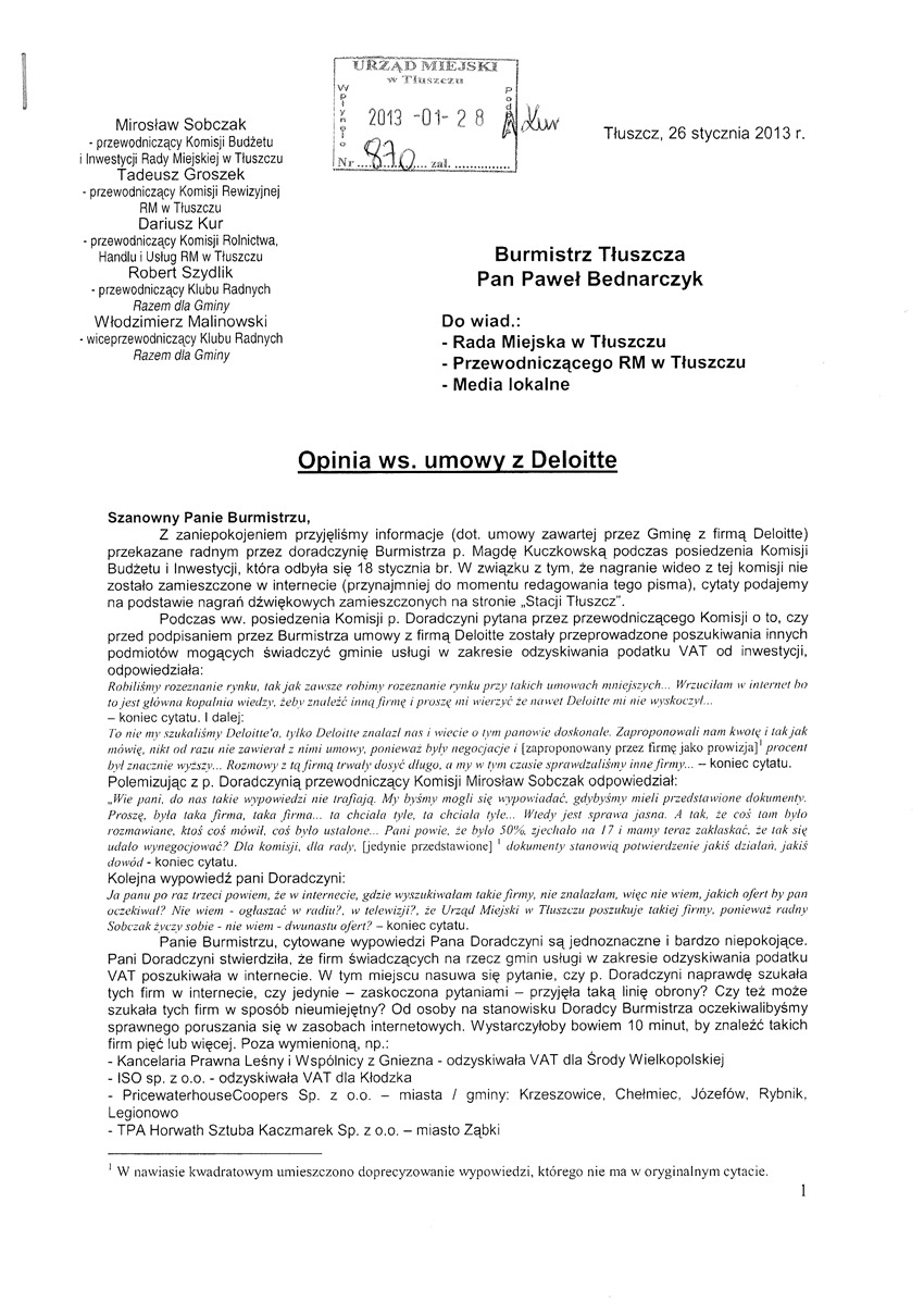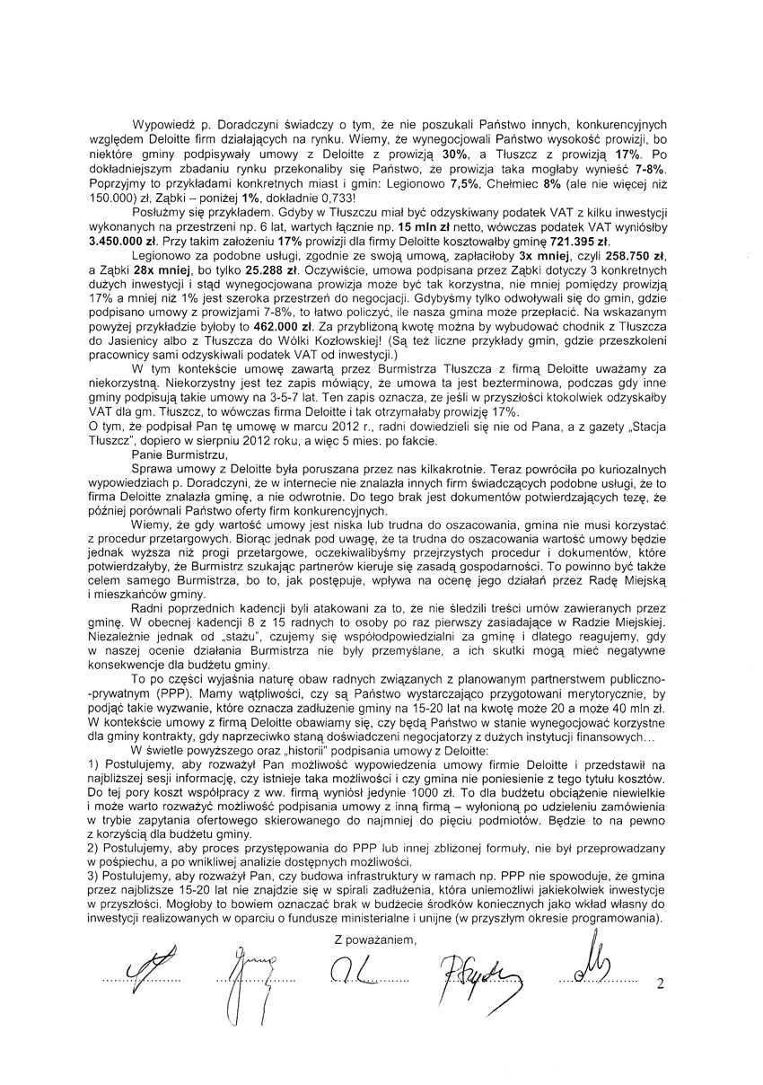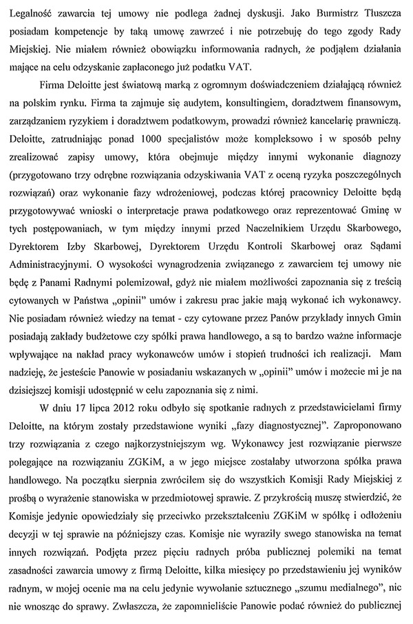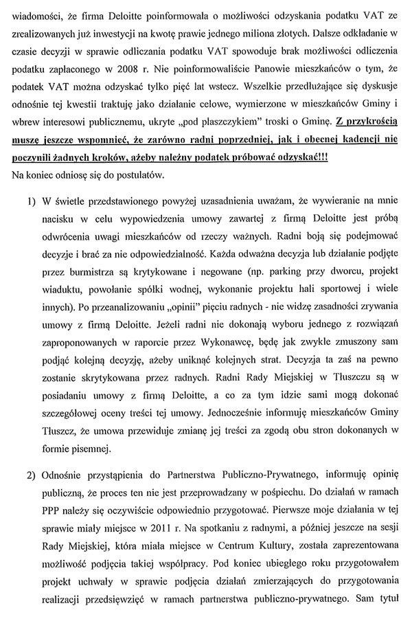 Wpis zaktualizowany o przesłane nam dzisiaj stanowisko Burmistrza Tłuszcza odnośnie krytycznej opinii radnych w spr. umowy z Deloitte.