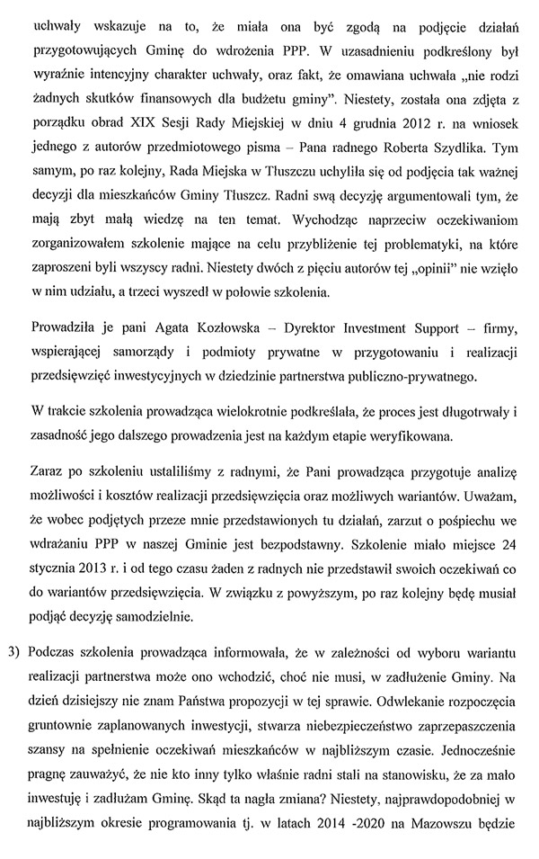 Ponadto autorzy opinii sygnalizują, że mają wątpliwości, czy tłuszczańskie władze i urzędnicy są wystarczająco przygotowani merytorycznie, aby zająć się realizacją projektów w ramach partnerstwa publiczno-prywatnego: „W kontekście umowy z firmą Deloitte obawiamy się, czy będą Państwo w stanie wynegocjować korzystne dla gminy kontrakty, gdy naprzeciwko staną doświadczeni negocjatorzy z dużych instytucji finansowych…”