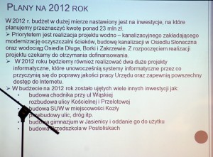 To bardzo ciekawa interpretacja – zwłaszcza, gdy weźmie się pod uwagę, że była to prezentacja dotycząca spraw publicznych – naszej gminy, inwestycji w 2011 roku i planów na 2012 rok, wygłoszona przez burmistrza wybranego i opłacanego przez mieszkańców i przygotowana, jak sądzę, za publiczne pieniądze.
