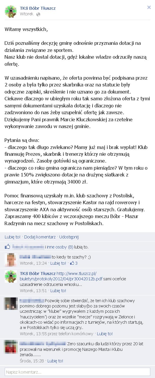 Co było do przewidzenia, taki a nie inny wynik konkursu, wzbudził emocje (vide wpis TKS Bóbr Tłuszcz na FB). „Dostało się” pani prawnik Marcie Kluczkowskiej (?) (podejrzewam, że chodziło o panią Magdę Kuczkowską), oraz klubowi szachowemu z Postolisk. Rozumiem rozgoryczenie i zdenerwowanie piłkarzy. Najpierw czekali na konkurs, później długo na – niestety – niepomyślne rozstrzygnięcie. A przecież przez te wszystkie miesiące Bobry musiały funkcjonować. I muszą działać nadal.